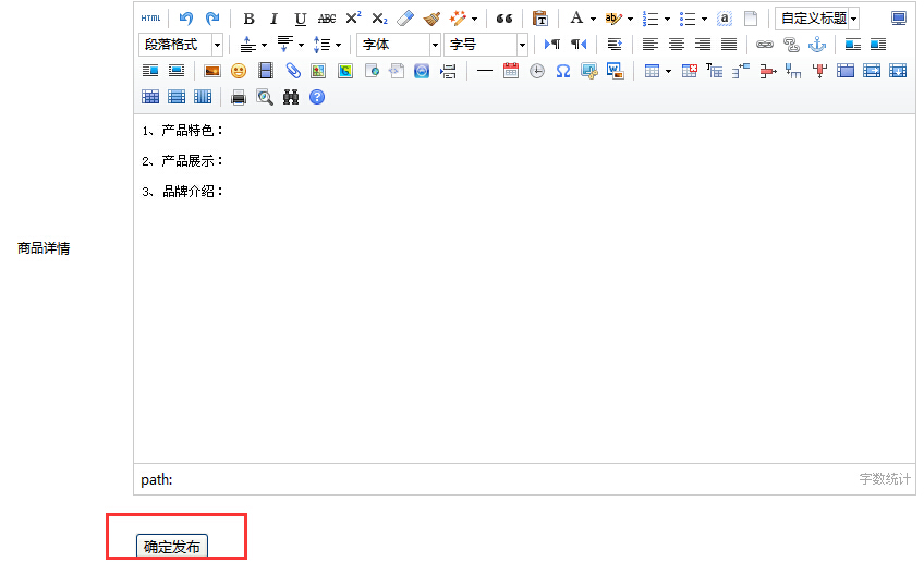 1、发布商品 第一步: 点击发布商品后,会弹出商品分类,分别为一、二、三级,商家可根据自己的产品分别对每一级进行归类,同时在宝贝模板处同步出现该类产品模板,商家可用宝贝模板进行发布,帮助用户尽快完成发布,供用户参考!如下图所示: 如果商家发布产品不在此分类范围内,可向平台进行申报,待审核后随之加入。申报流程具体由招商部负责。 点击 第二步:点击 自定义分类:商家可根据产品分类自行进行新增、删除和修改。 商品名称:商家对商品名进行填写,例如:品牌+品名+系列+型号等 天韵系列固定座椅--无靠背 TY-007 产品编号:不用填写,系统自动生成。 销售状态:下拉菜单中包括了9种状态可进行选择,如果商家销售状态需要新增选项,请申报到招商部,待确认后进行新增;促销文字以简单一句话为准,例如:买3增一,送礼品等。 商品搜索关键字:此处非常重要,关系到商家的该款产品的搜索排行以及推广,关键字越准确,搜索到的频率越高,曝光率越强。依据下面提示信息进行填写; 一句话描述:此处不能填写太多文字,一句话概括,主要以公司宣传口号为准,例如:世界品牌 高品位的选择 报价部分:厂家零售价、完工参考价、材料价、平台协议价、单位、净含量、库存量,以下内容都是必填项,具体填写请参看提示说明; 品牌:商家要先行将品牌logo图(177*63像素)进行上传,把您的品牌添加到品牌库中才能在此显示并进行选择操作,否则您店铺下的所有商品将不能在页面中按照品牌很快的搜索到。点击”管理品牌“后会有一个弹出框,点击“新增品牌”后填写品牌名称、首字母、品牌LOGO图,等信息完善后点击“确定新增”,信息填写完毕出现品牌列表,可自行进行编辑和删除。然后刷新页面在品牌列表中进行查找并选择。可以点选字母进行查找。 商品图片:此处要求上传同一商品不同方位、不同角度、不同颜色等内容产品分解图,方便用户详细了解。最多上传5张,尺寸为800*800像素; 分类参数:根据不同商品的性能而定,如果现有参数内容不能满足需求,可自行进行对内容在每项对应的输入框中重新输入即可,如果要新增参数项,点击“参数管理”自行设定参数。 (1)点击“新增参数” (2)填写参数所属分类、参数名称等,点击“确定新增”进行保存。 (3)点击“新增子参数项值”,添加该参数下的子参数值,最后点击“确认新增进行保存。 (4)进入参数列表页中显示添加的参数内容,在操作一栏可进行编辑和删除。 商品详情:主要描述产品的特点、产品性能、产品不同角度的展示、产品分解图、品牌介绍等等内容,让用户看的越清楚越好,了解的更详细,达到更好的推广效果。特别说明:不能出现与该产品无关的信息内容,比如公司电话号码和联系人信息、不同产品内容等等不合适信息,否则平台会对该产品进行屏蔽。 点击 2、展示的商品 3、自定义分类 自定义分类就是指对该店铺下的产品进行分类管理,可以根据产品而定,方便用户有针对性的查看。